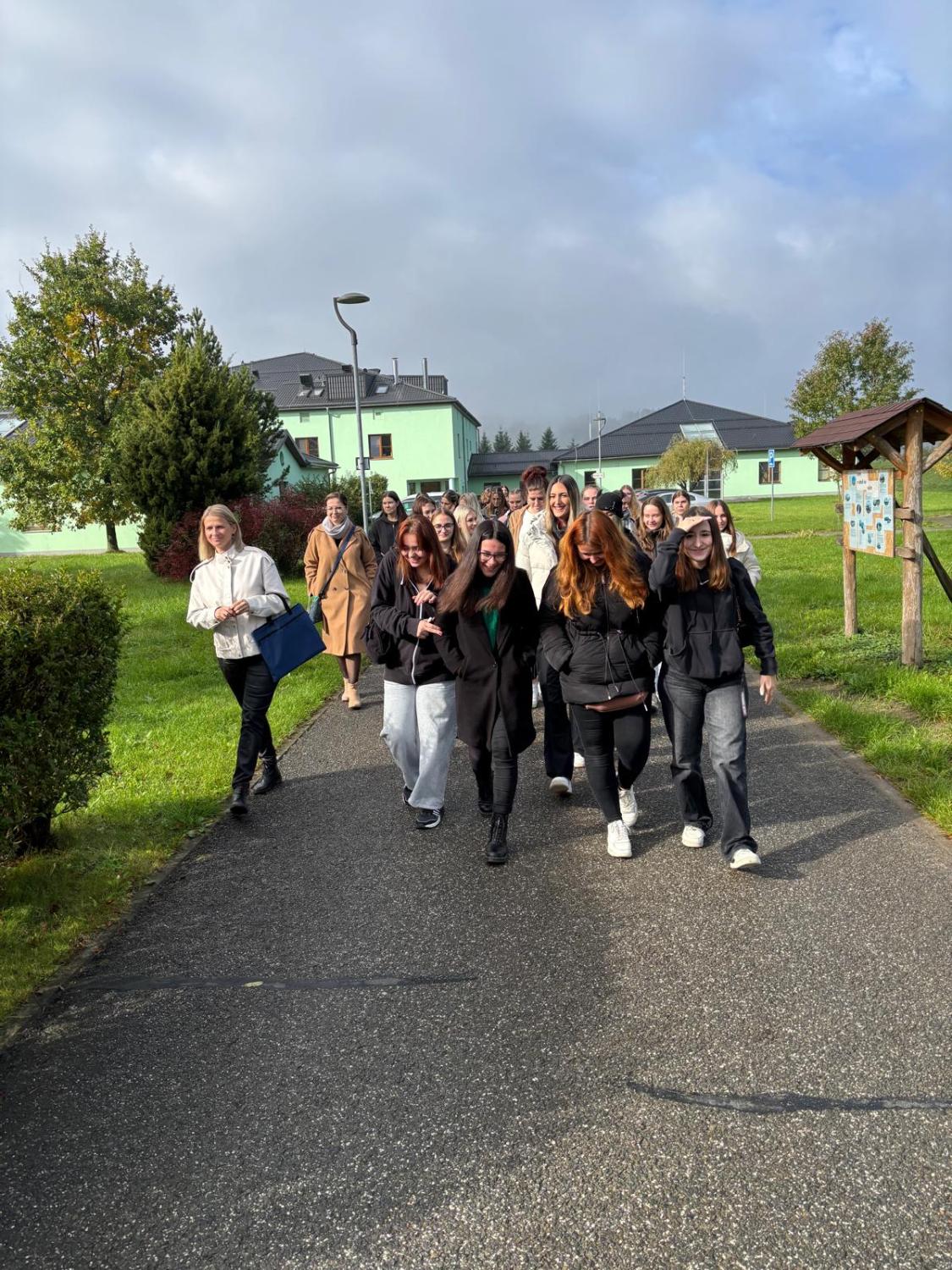 Po prohlídce jsme se přesunuli do Malenovic, kde jsme byli ubytováni v hotelu KAM. Po skvělém obědě, (kuřecí kebab s hranolkami), jsme si na chvíli odpočinuli a poté se pustili do první společné aktivity – seznamovací hry „pravda/lež“. Každý o sobě řekl tři věty, z nichž dvě byly pravdivé a jedna ne, a ostatní hádali, co je lež. Bylo to zábavné a někdy i dost překvapivé! Skupina 1.A hrála aktivitu "klíče", pomocí které se představovali druhým. Poté následovala procházka na vyhlídku, vodopády a společné kafíčko.