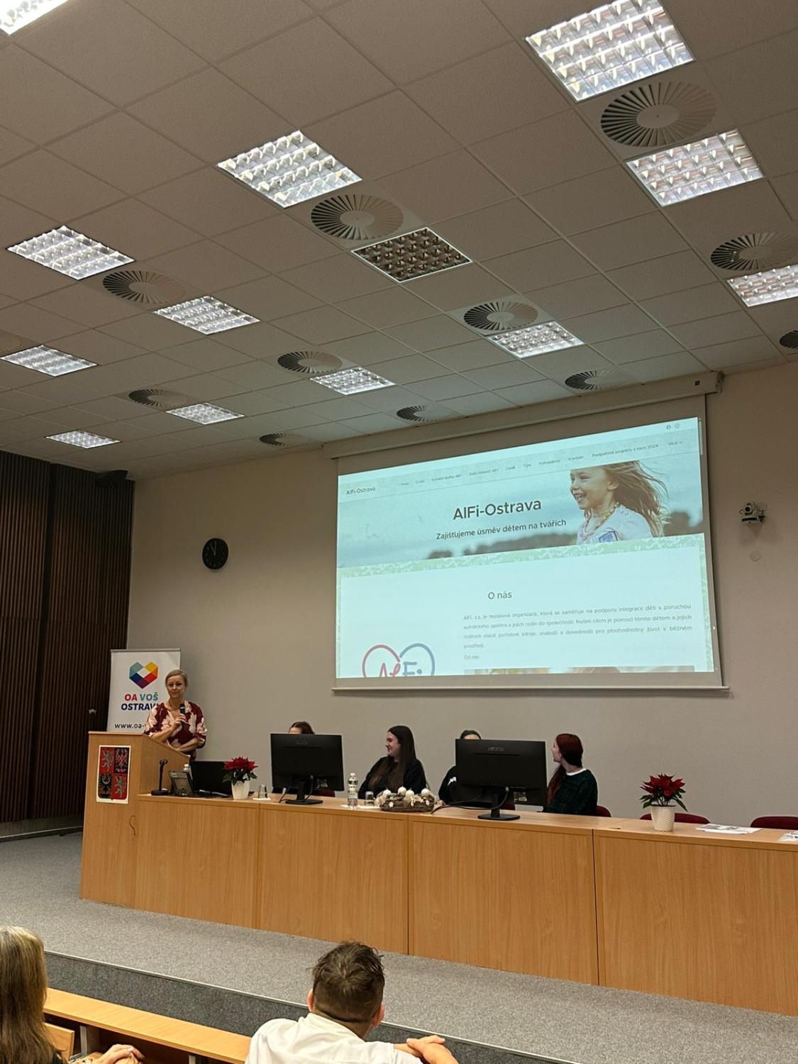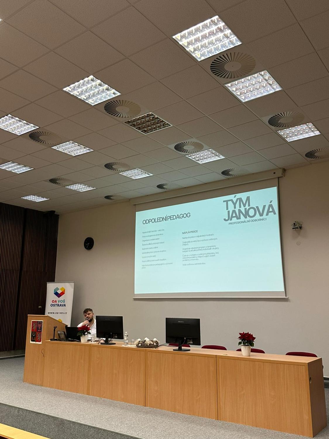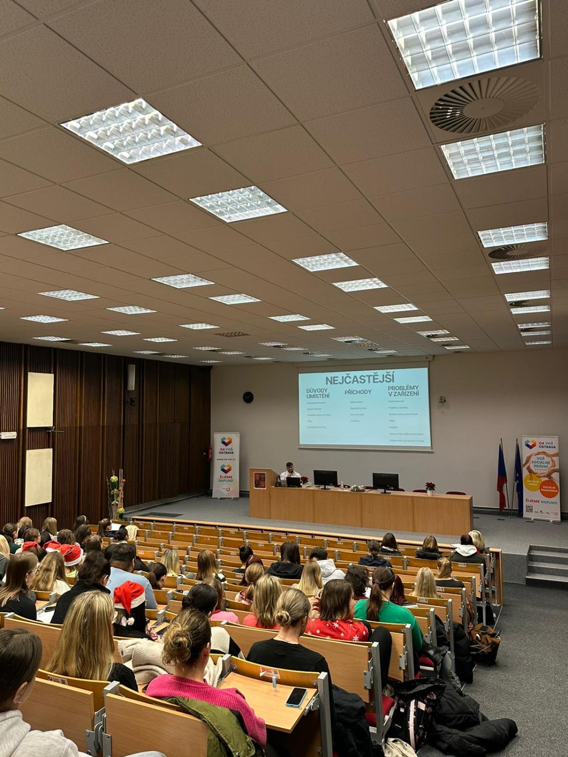 V úterý 2. prosince 2025 jsme se na VOŠce společně naladili na předvánoční atmosféru během našeho tradičního Vánočního jarmarku. Program jsme zahájili pracovně – odbornou přednáškou o práci vychovatele ve Výchovném ústavu Ostrava-Hrabůvka, pracoviště Polanka nad Odrou, na Oddělení pro chlapce vyžadující soustavnou intenzivní individuální péči. Poté jednotlivé třídy denního studia představily svou adoptovanou organizaci a aktivitu, kterou v rámci spolupráce naplánovaly či zrealizovaly. Vyhlásili jsme také výsledky sbírky Bílá pastelka a ocenili ty nejúspěšnější. K atmosféře jarmarku přispěl prodej tematicky laděných rukodělných výrobků klientů sociálních služeb Charity sv. Alexandra, Mens Sana, z.ú. a Prapos, z.s. Adventní chvíle nám zpříjemnil výborný vánoční punč, cukroví a koledy, které zněly celou školou.