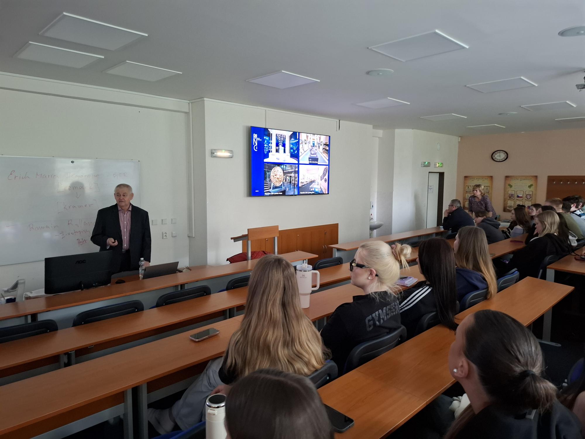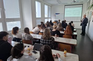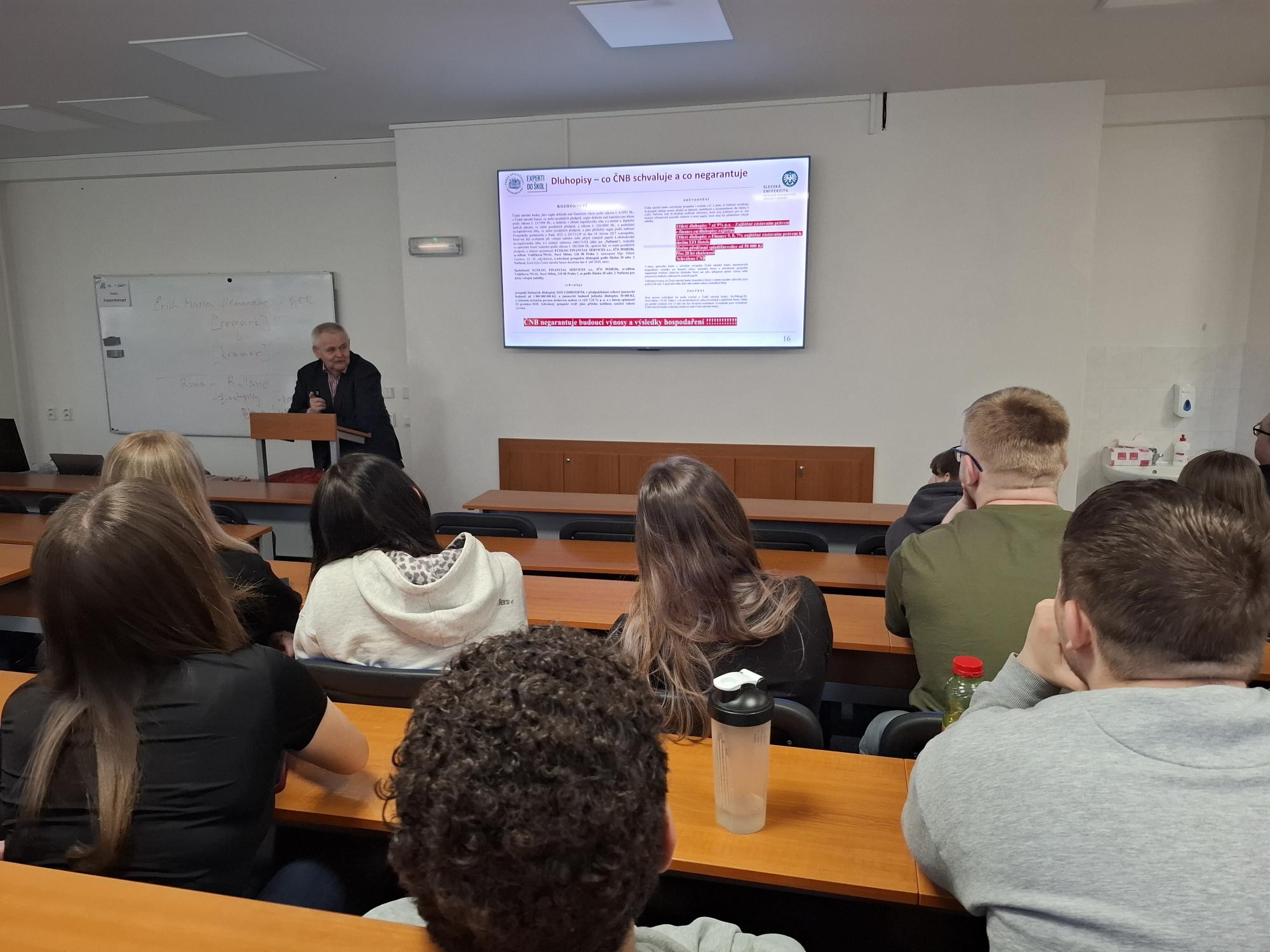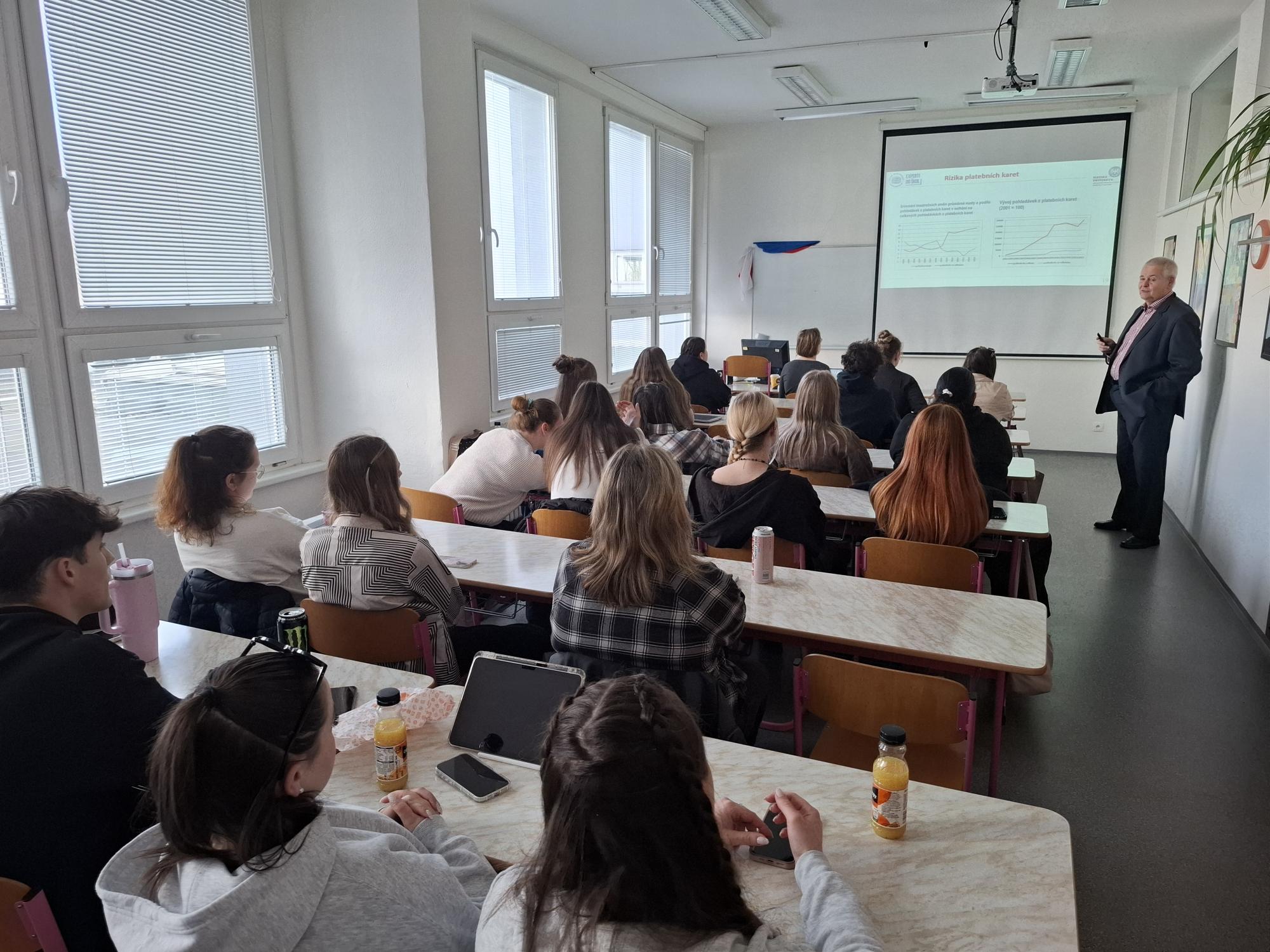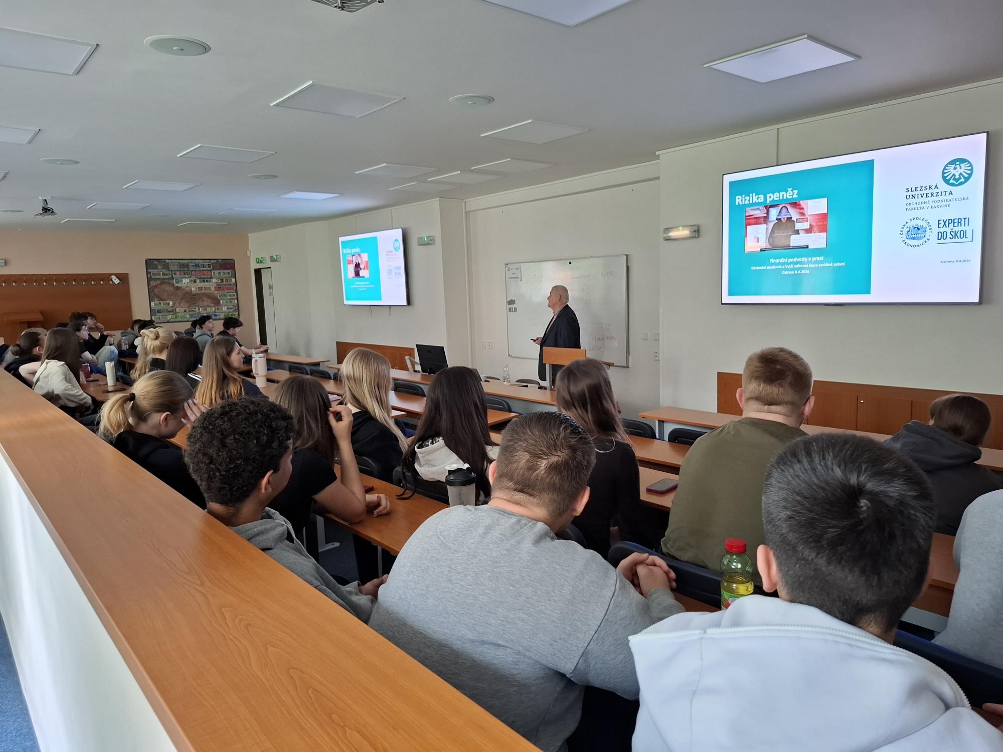 Ve středu 8. dubna 2026 proběhla ve škole přednáška na téma "Finanční podvody v praxi" pro žáky 2. B a 2. S, kterou vedl Ing. Ilja Skaunic, MBA, Ph.D.,  praktik se zkušenostmi s vedením ostravské pobočky České národní banky a zároveň akademik z Obchodně podnikatelské fakulty v Karviné. Devadesátiminutový workshop byl umožněn v rámci projektu Experti do škol, jehož cílem je přiblížit středoškolským studentům ekonomii v praxi pohledem uznávaných českých ekonomů z řad vysokoškolských pedagogů a finančních odborníků. Doufáme, že přednáška povede k větší prevenci ve finančním chování našich žáků.