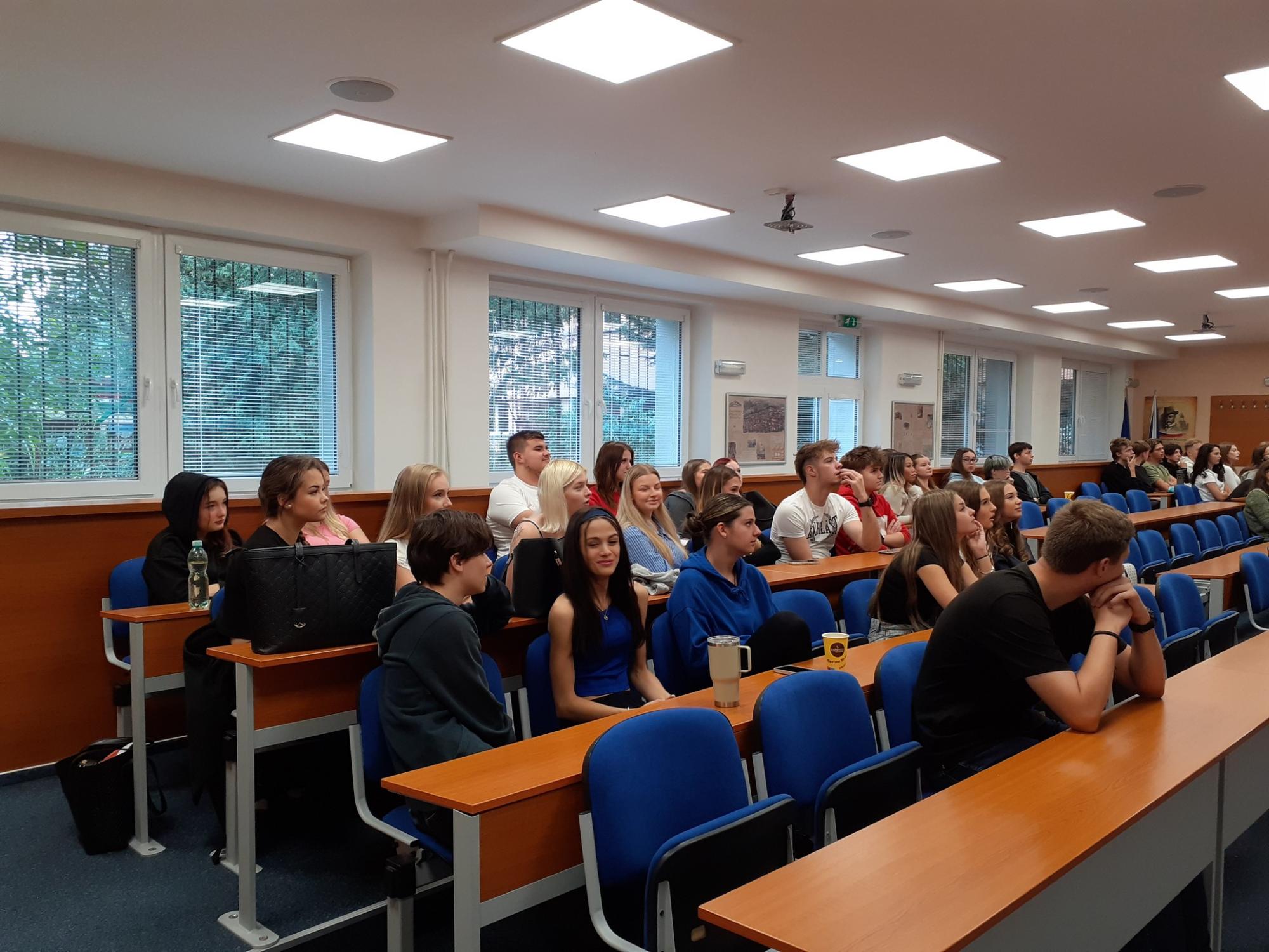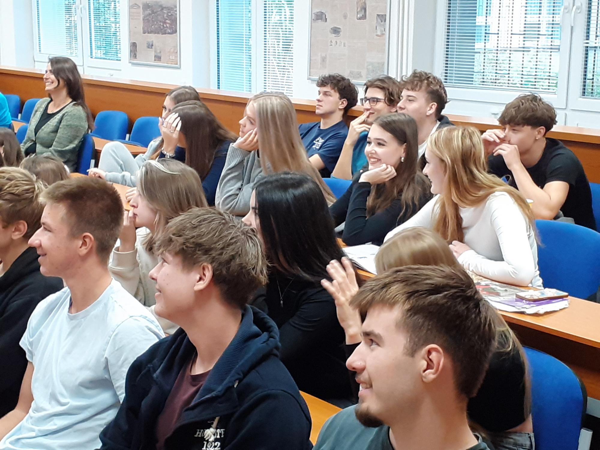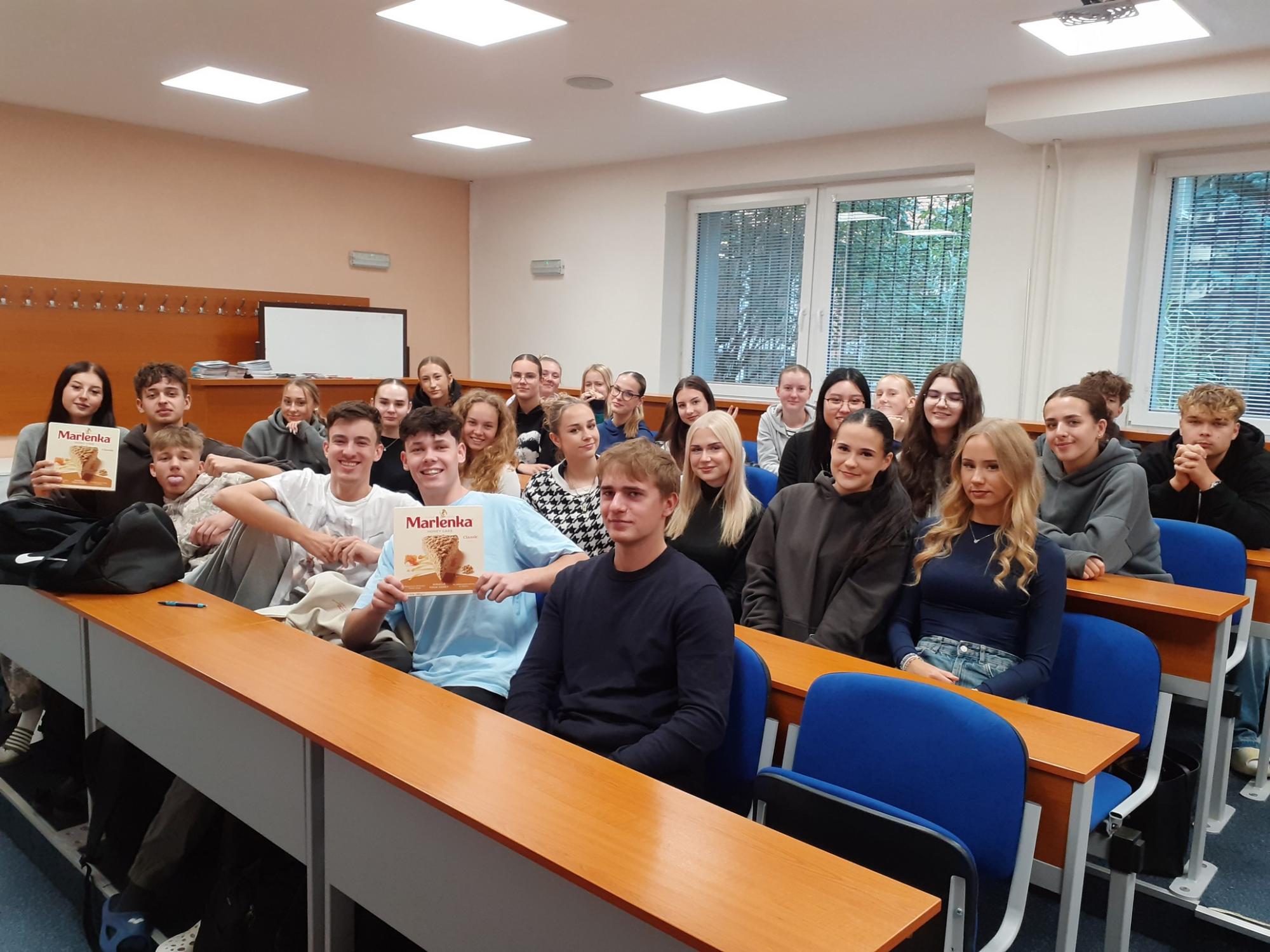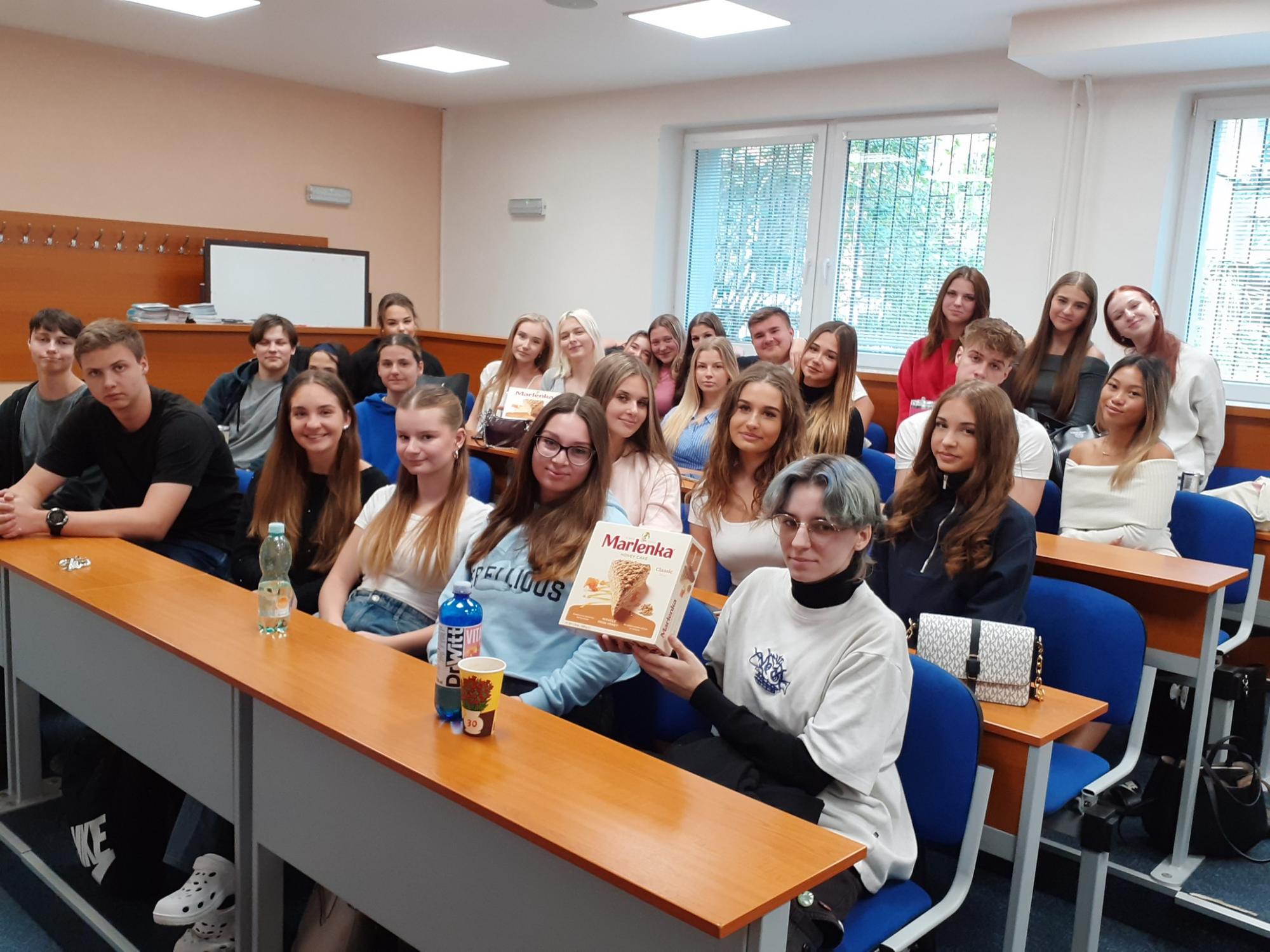 V pátek 26. září jsme proto uspořádali speciální dvouhodinový program v angličtině pro studenty třetích ročníků. Nejprve se uskutečnil zábavný kvíz o anglicky mluvících zemích, v němž mezi sebou soutěžily vždy dvě třídy. Všichni se snažili ze všech sil, ale vítězi se mohly stát jen dvě třídy ze čtyř – tentokrát 3. A a 3. S, které si za odměnu pochutnaly na dortu Marlenka. Gratulujeme!