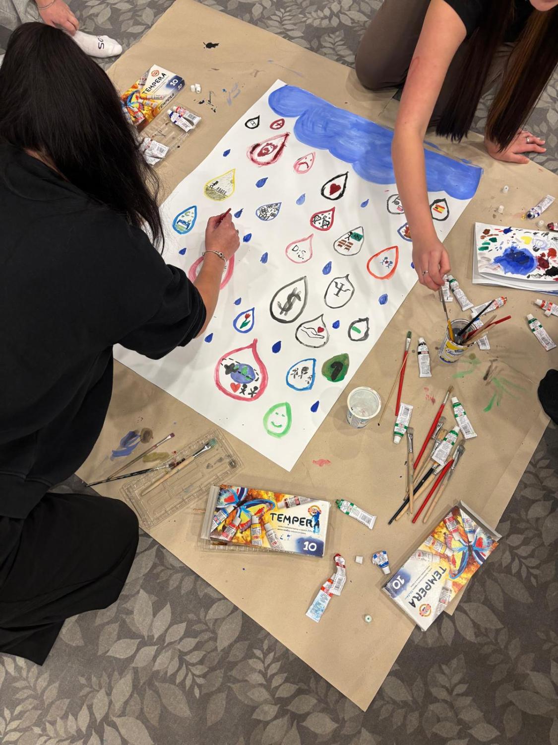 Třída 1.A nakreslila mrak, ze kterého padají kapky, a v každé kapce byl obrázek, jak se daný student vidí v budoucnu.